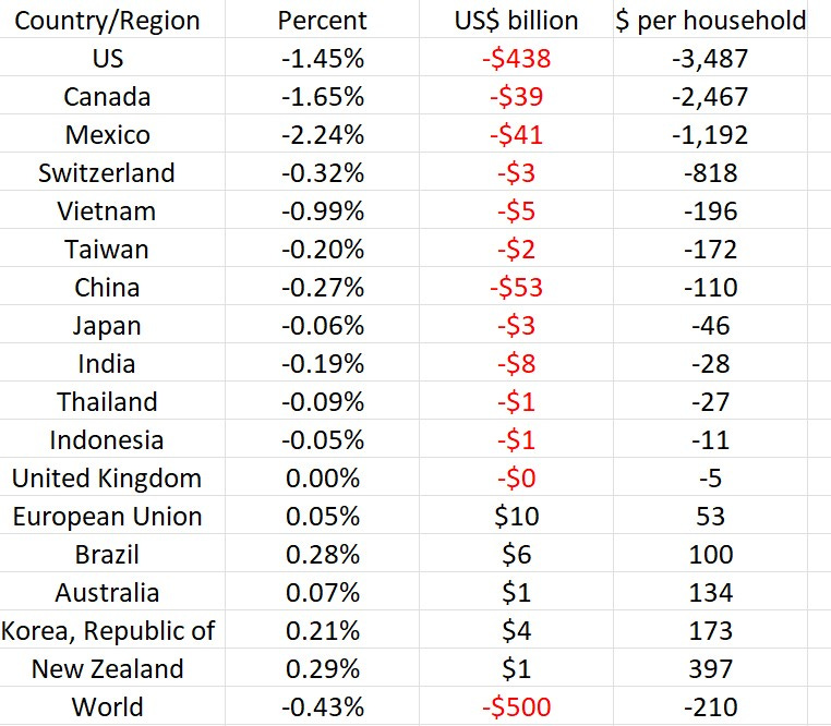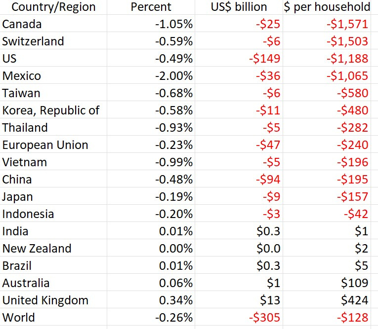 (1) Other countries impose a tit-for-tat policy. Computable General Equilibrium models show the impact. The biggest loser is the US both in total as well as on a per household basis.