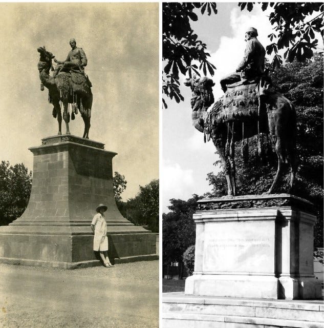 The ship transporting the statue, the SS Cedardene, was in collision with a Russian ship in the Thames and sank. It was refloated after three tides, the statue, in its skeleton crate, was hosed down and put on the SS Lesbian (yup, that was the name of that ship) that was sailing to Alexandria a few days later. Prior to its arrival in Khartoum the statue was submerged in the Nile. Finally it managed to arrive at Khartoum. The picture on the left is when it was in Khartoum. The lady standing at the foot of the statue is General Gordon’s wife (this is from 1928).
